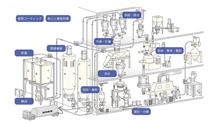 この他、粉粒体をあたかも流体のように扱い、空気の流れを利用して配管を通じ輸送する空気輸送装置をはじめ粉粒体の貯蔵、輸送、供給排出、充填計量、混合、粉砕解砕、整粒などを可能にする多種多様な機械を製造しています。(製品一覧はこちら⇒ https://www.aishin-sangyo.co.jp/products)