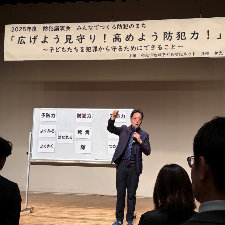 メンバーがいろいろな講演会などに参加して「この人、講師としていいなあ。」と思って、「こんな人がいるんですけれど」って和光市の危機管理室さんに相談することが多いです。和光市の防犯リーダー養成講座と兼ねる形で防犯講演会を実施していることもあり、講師との交渉や会場の確保などは市が、広報は当会が行っています。その際、市内小中学校保護者向け一斉送信メールでは教育委員会にも協力をいただいています。チラシのデザインは、和光市地域子ども防犯ネットのメンバーが作成しています。