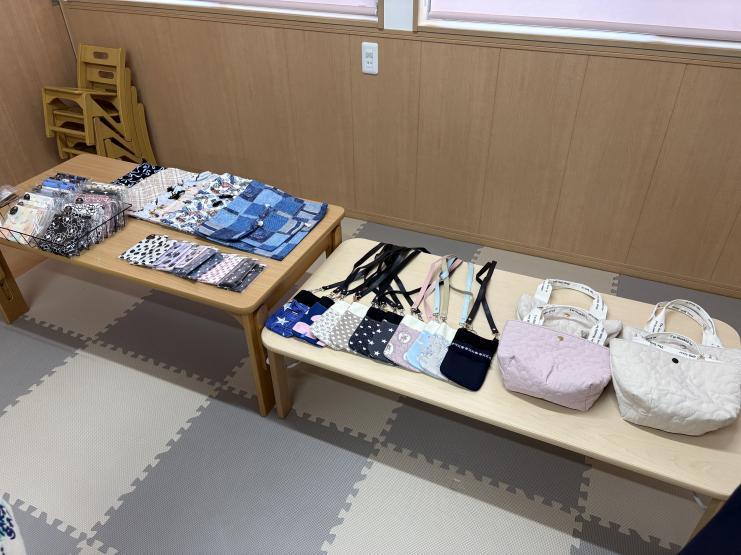 今回は大きな部屋に案内していただき、はじめに目に入ったのは、机に並んだ手芸品の数々です。製作者は中学生で、ご家族のかたにお話を伺いました。手芸は初めから得意だったわけではなく、ご自身の意思で、書籍などを用いて独学でここまで仕上げたそうです。生地選びからデザインの企画、裁断、縫合などを自由に行う活き活きとした姿が容易に思い浮かぶようなものがたくさんありました。これらは昨秋ごろに、武蔵嵐山駅で開催された「らんざんマーケット(ROPA COFFEE主催)」で、当法人を通して販売されました。