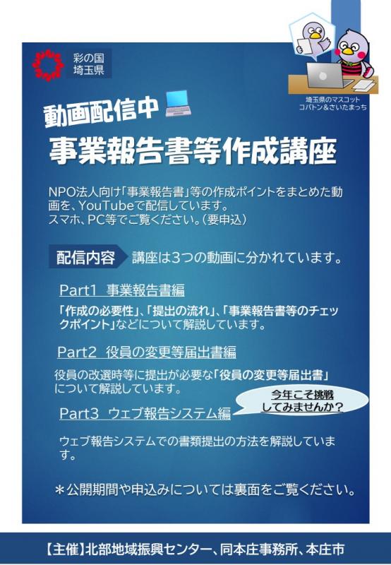 北部地域振興センターでは、同センター本庄事務所、本庄市市民生活部市民活動推進課との共催により、北部地域NPO法人事業報告書等作成講座をYouTube(埼玉県限定公開セミナー動画チャンネル)で動画配信しています。
