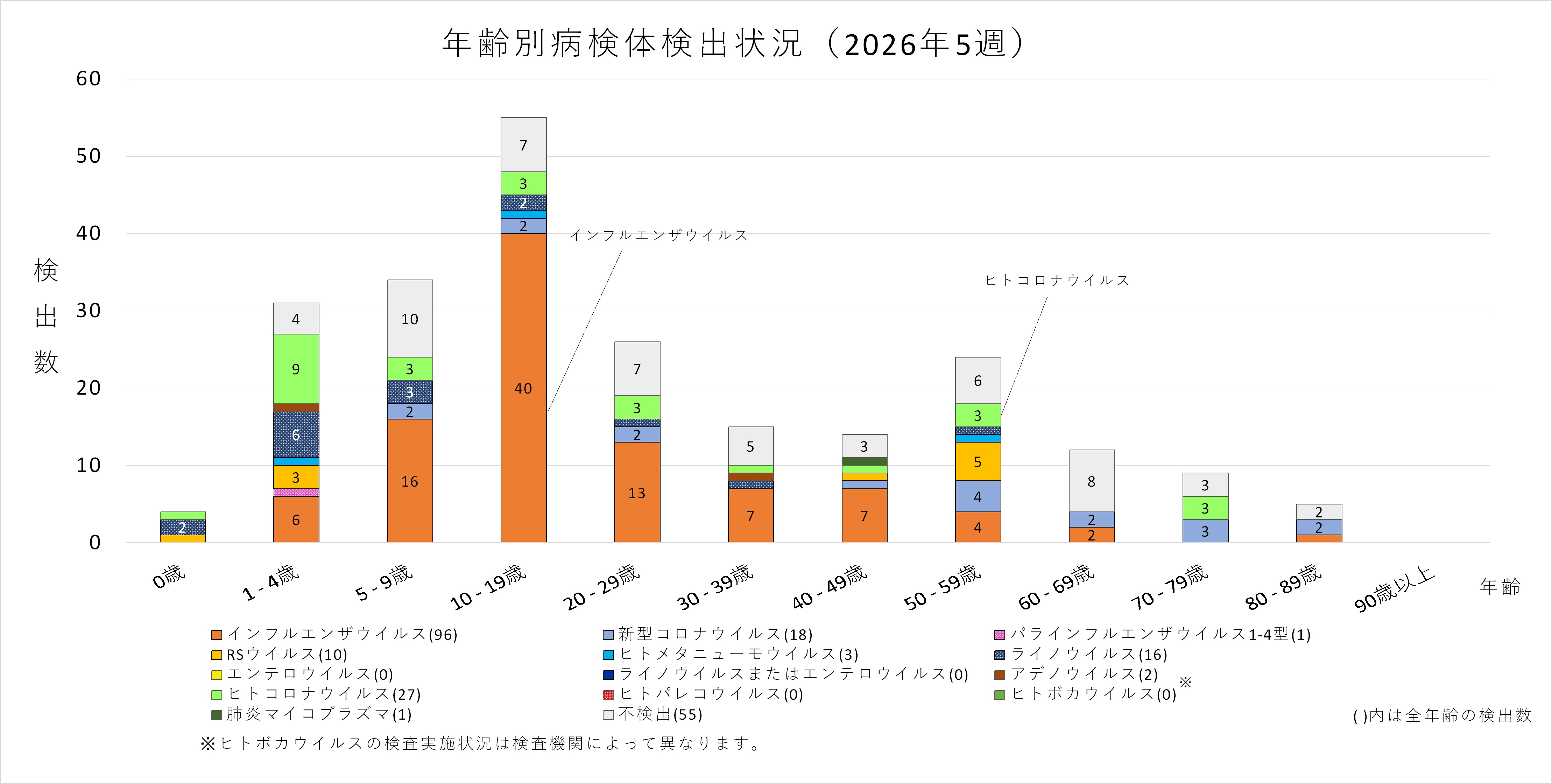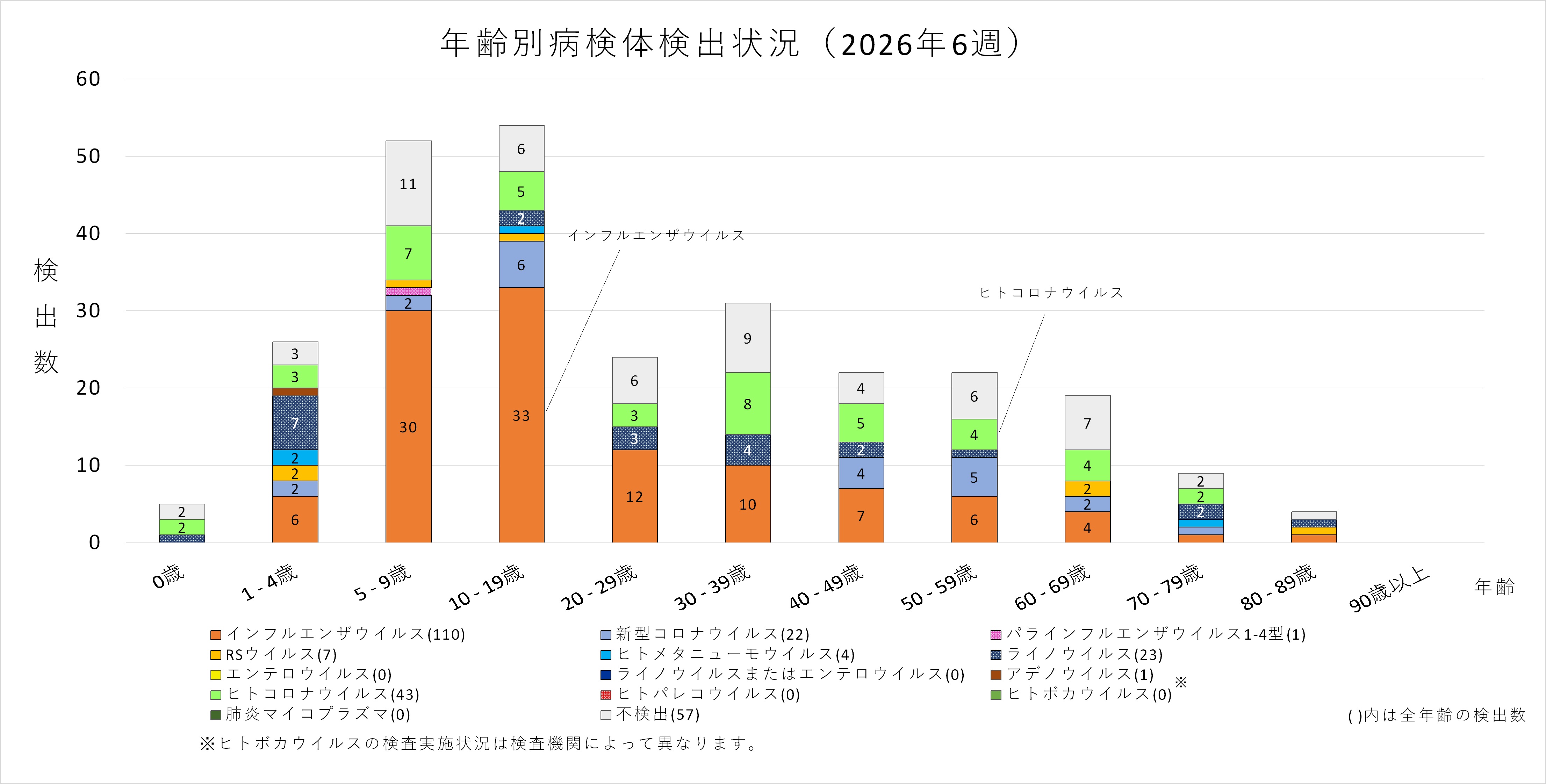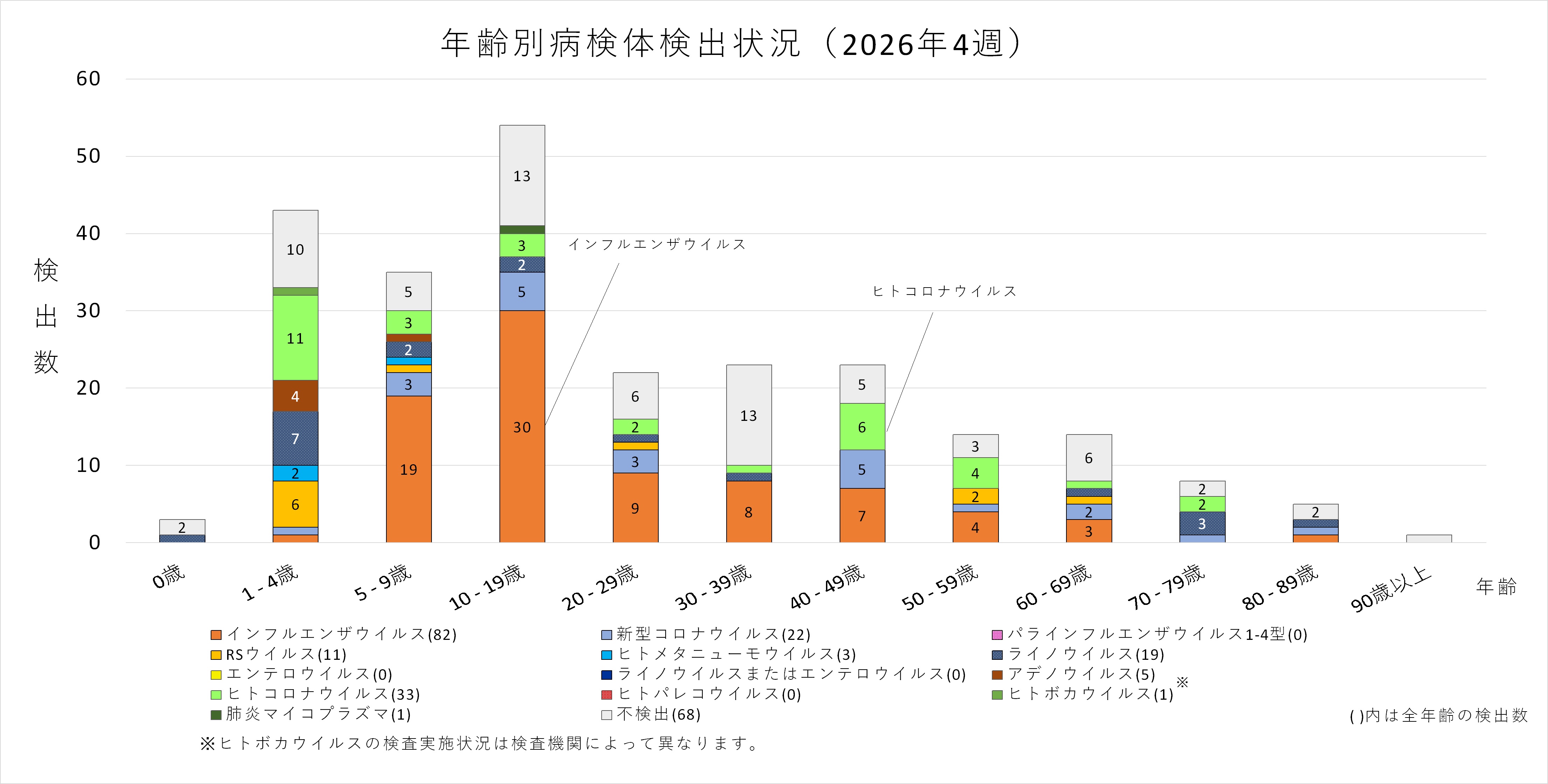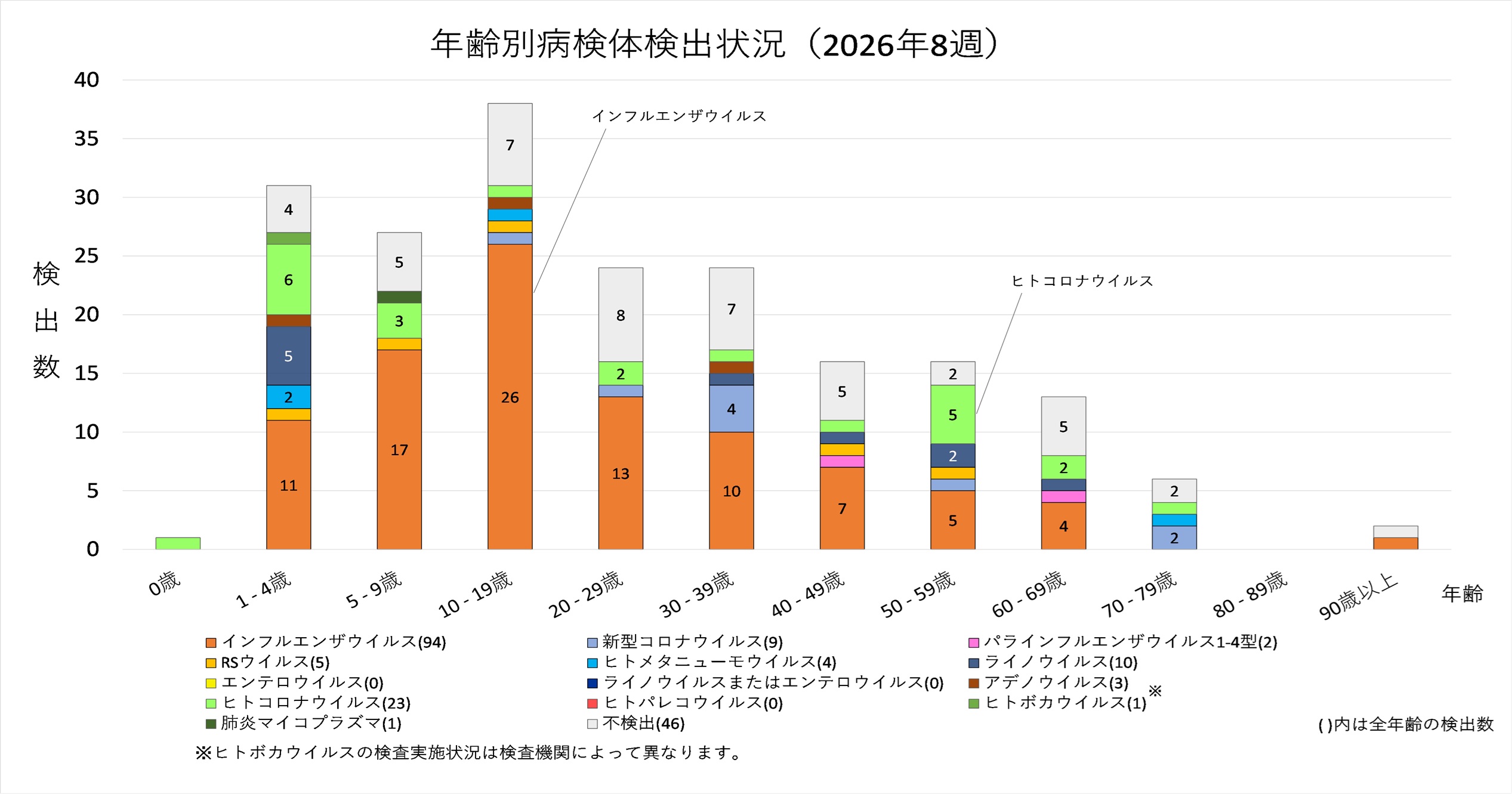 年齢層別にみると、1歳から80歳未満の幅広い年齢層でインフルエンザウイルスが検出され、5歳から20歳未満では採取された検体の半数以上からインフルエンザウイルスが検出されています。また、ヒトコロナウイルスも多くの年齢層で検出されており、1歳から5歳未満ではインフルエンザウイルスよりヒトコロナウイルスが多く検出されています。