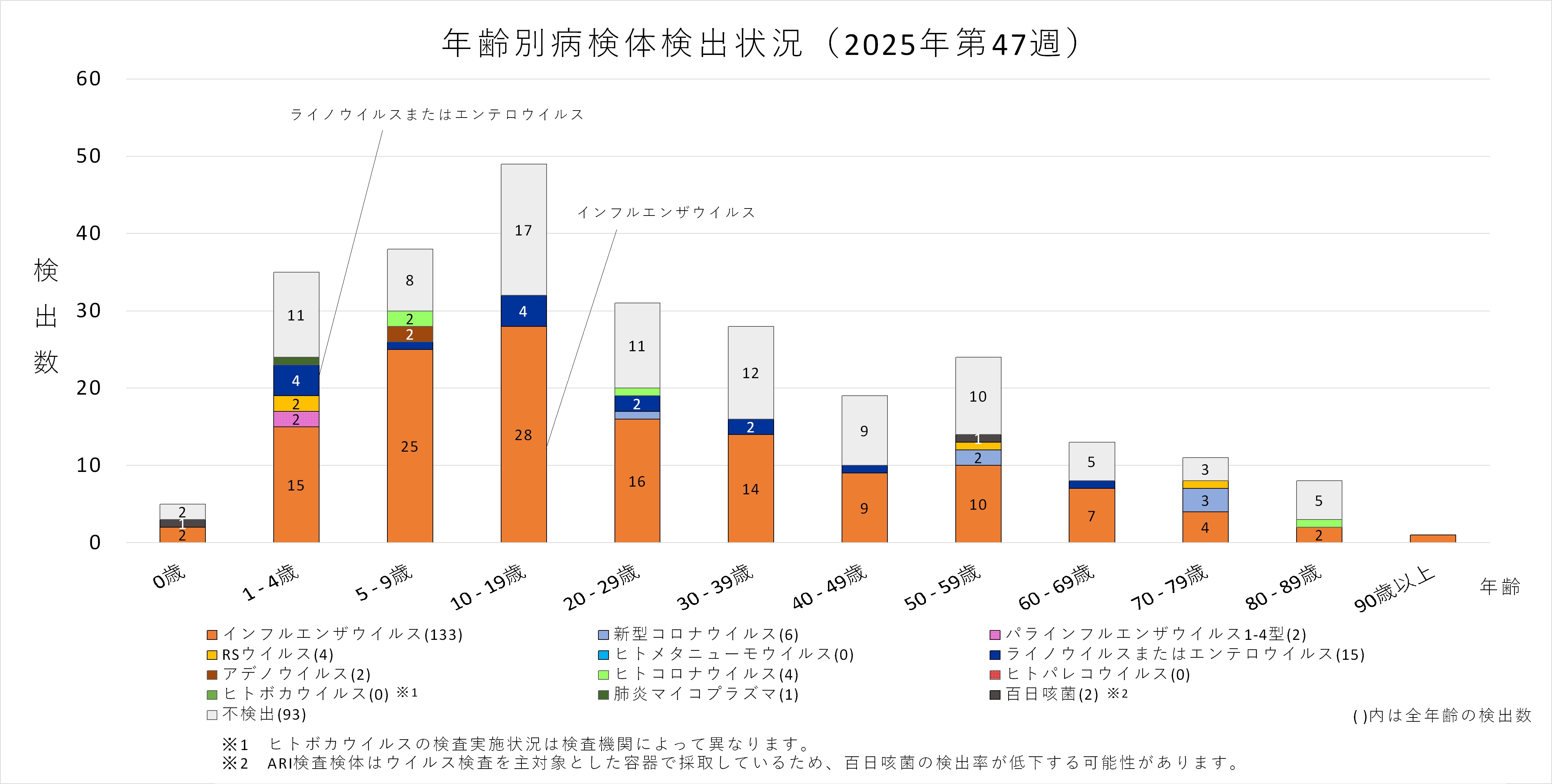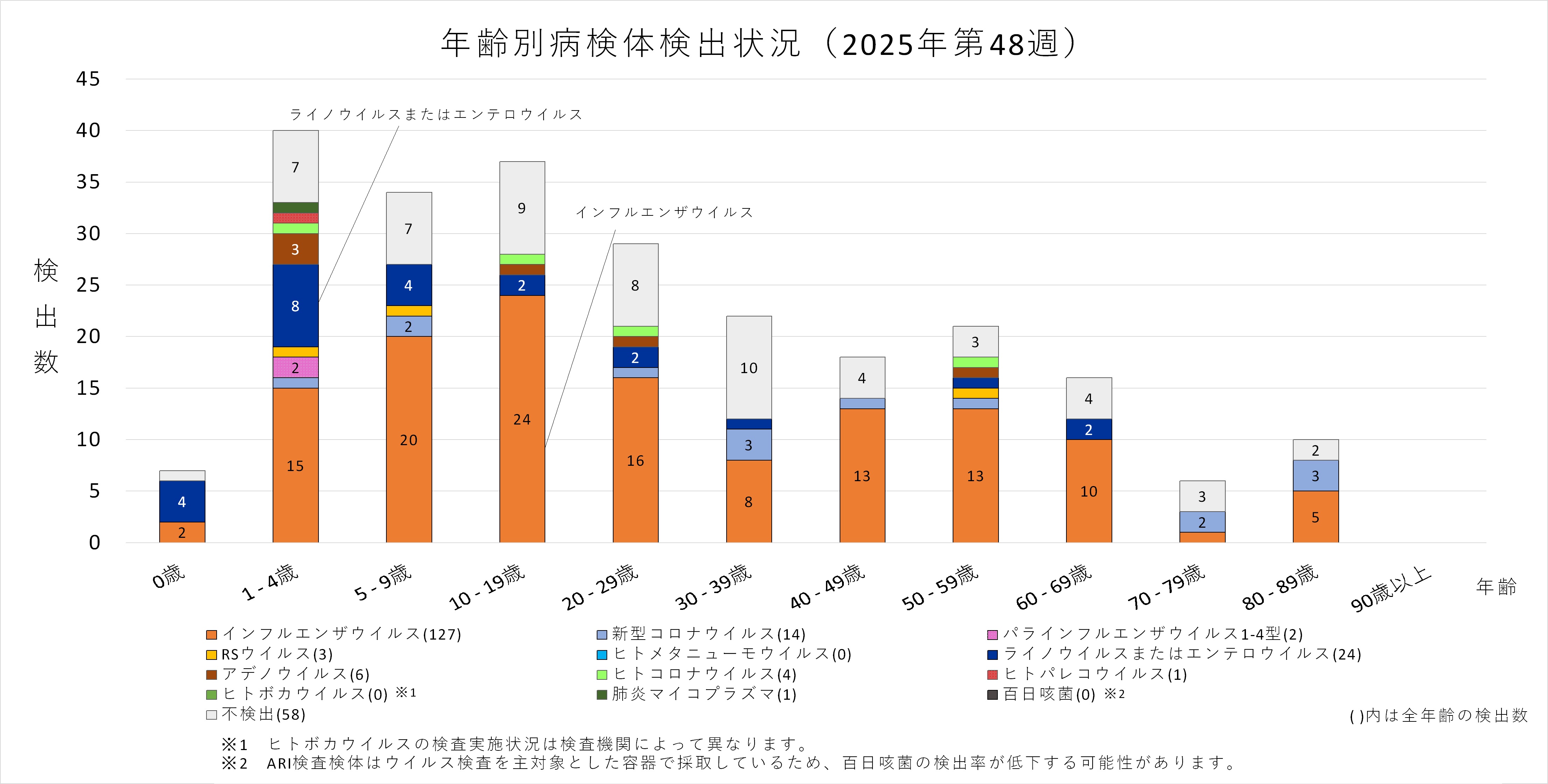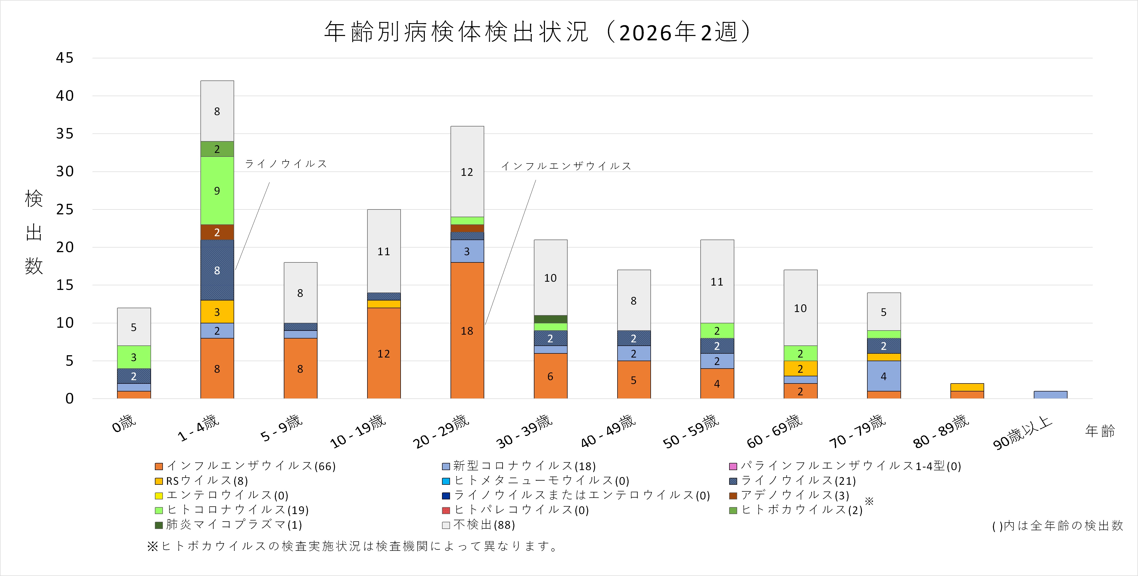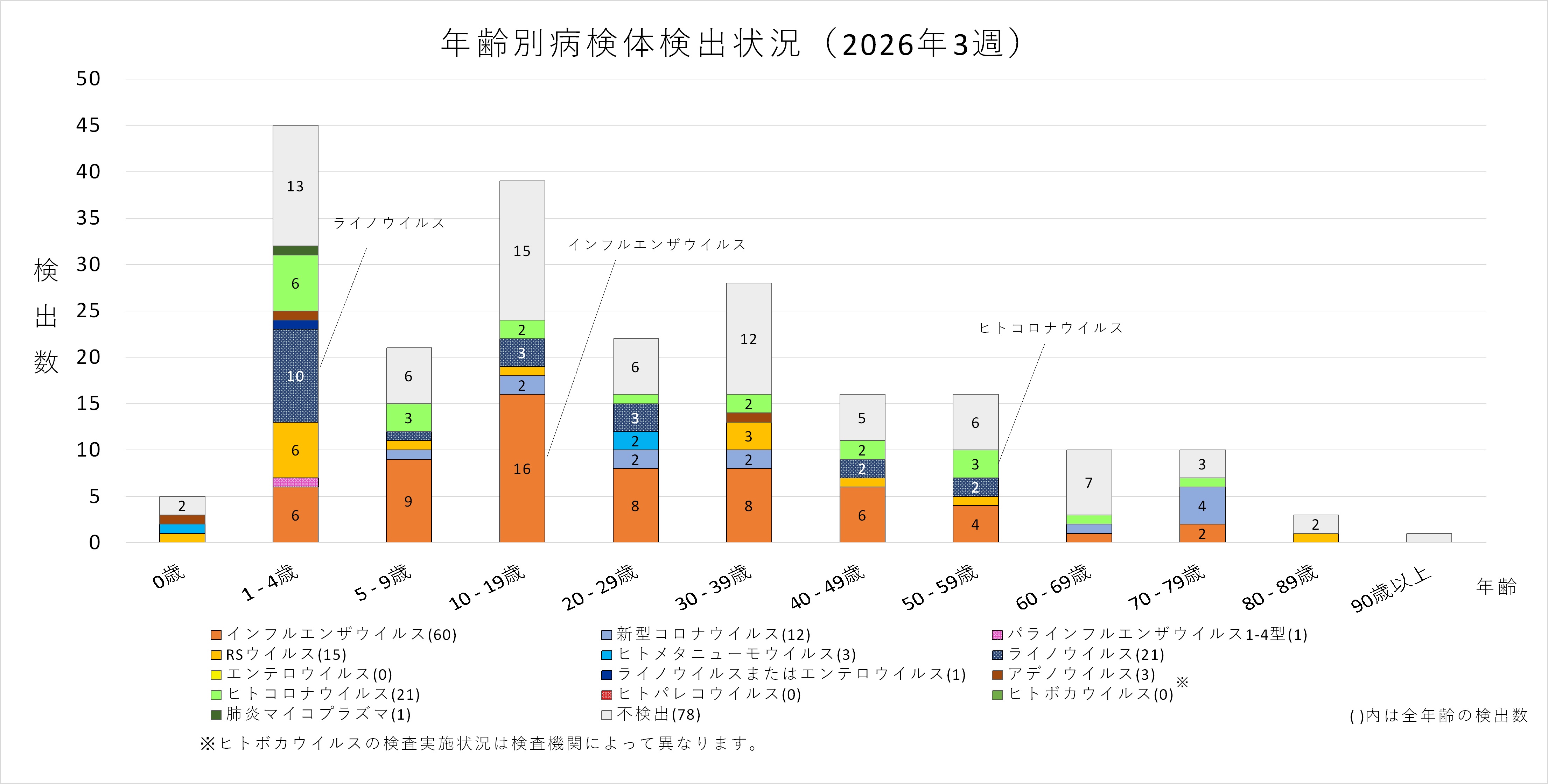 年齢層別にみると、1歳から80歳未満の幅広い年齢層でインフルエンザウイルスが検出され、5歳から20歳未満では採取された検体の半数以上からインフルエンザウイルスが検出されています。また、ヒトコロナウイルスも多くの年齢層で検出されており、1歳から5歳未満ではインフルエンザウイルスよりヒトコロナウイルスが多く検出されています。