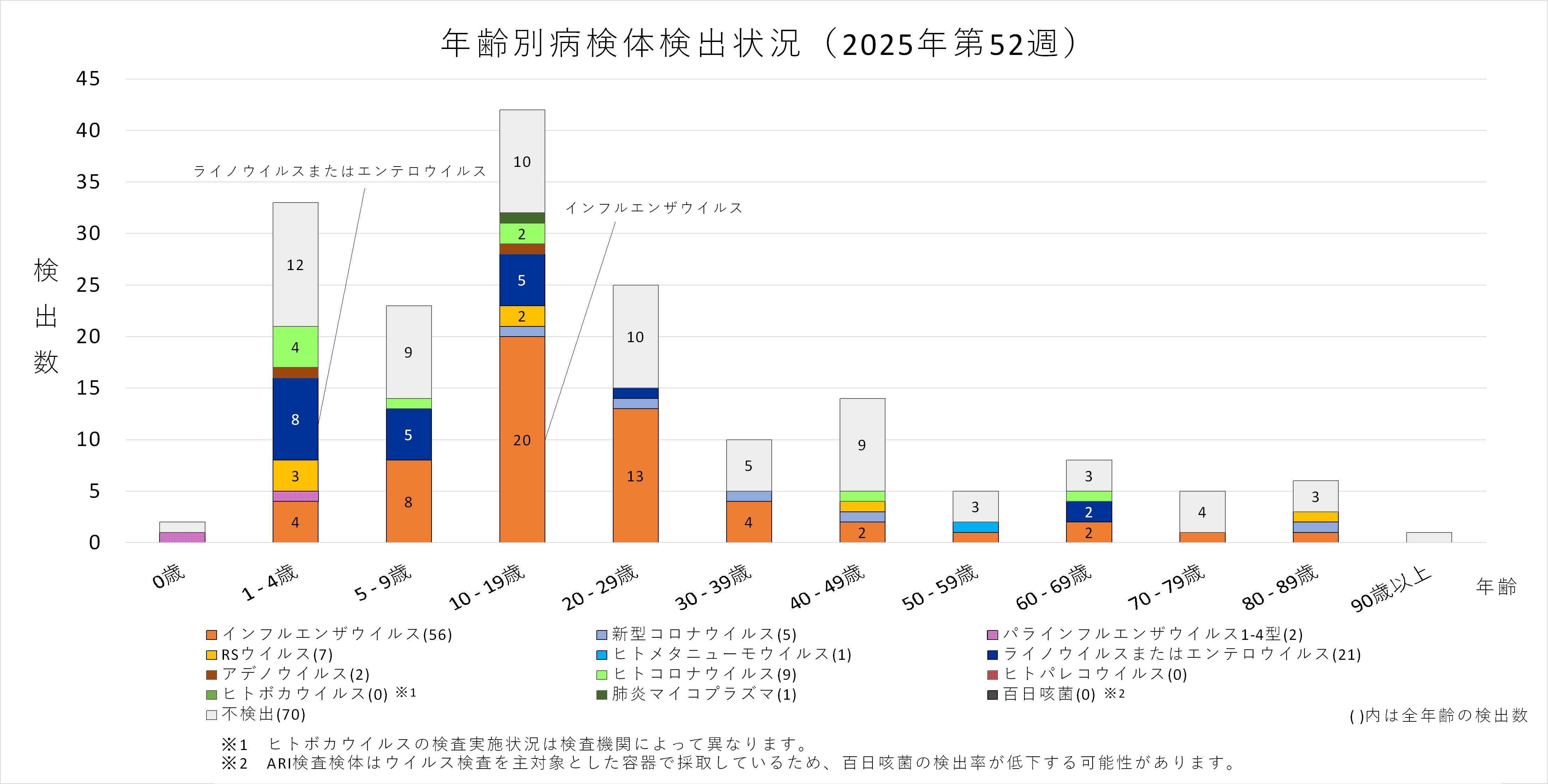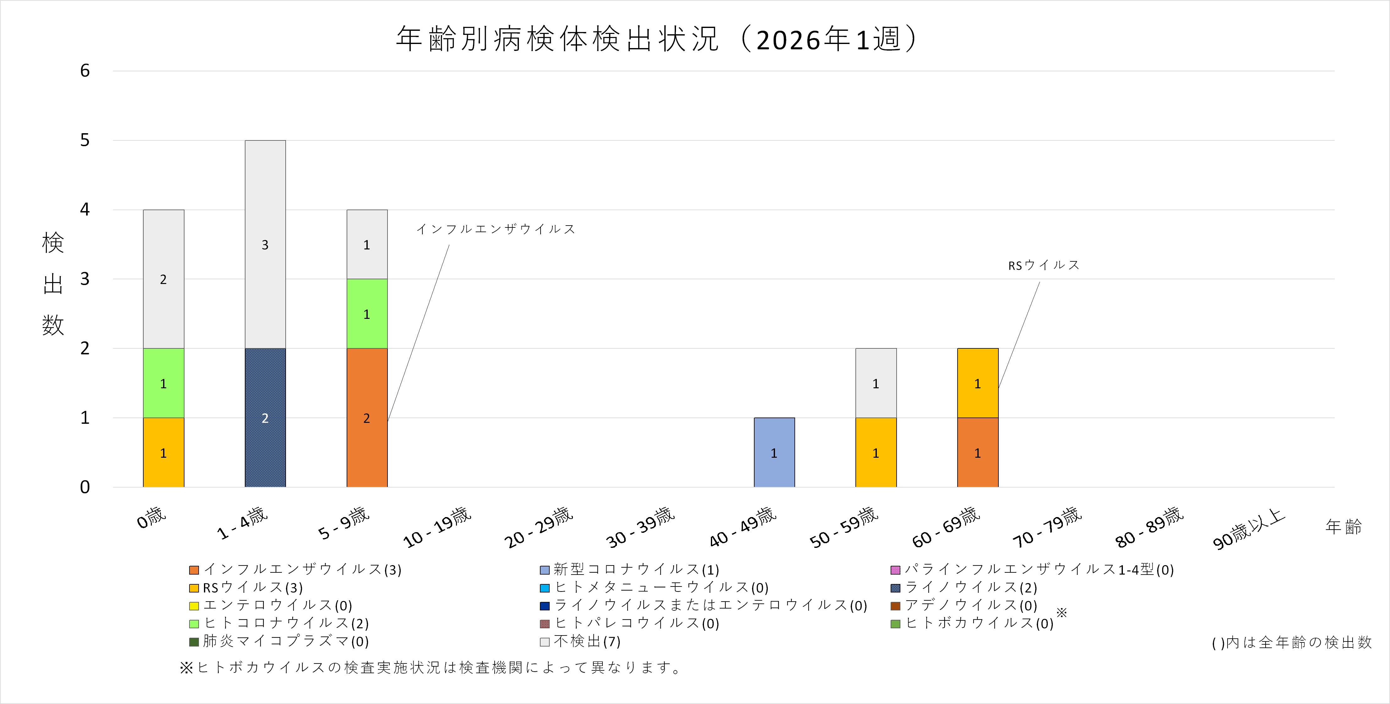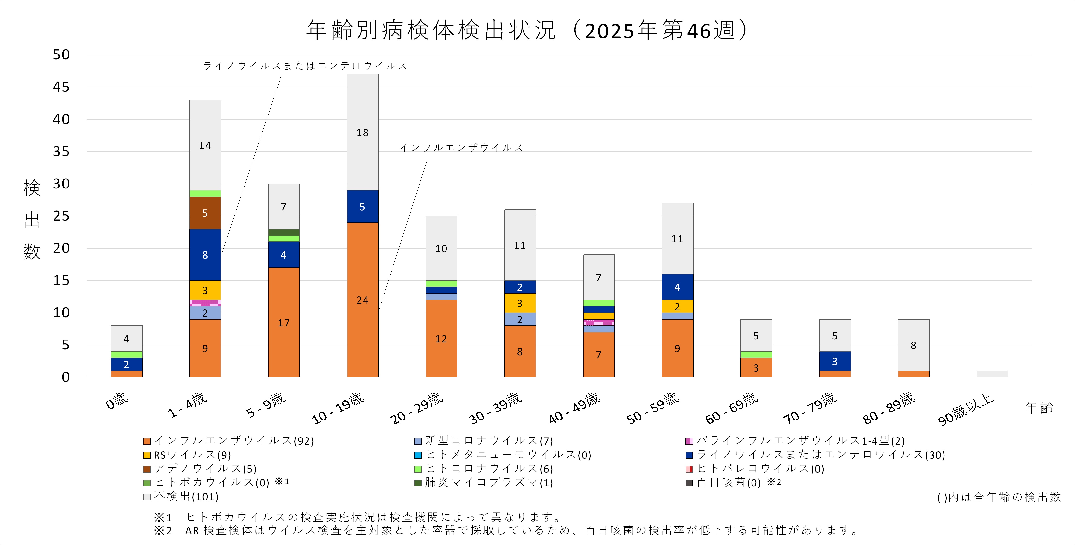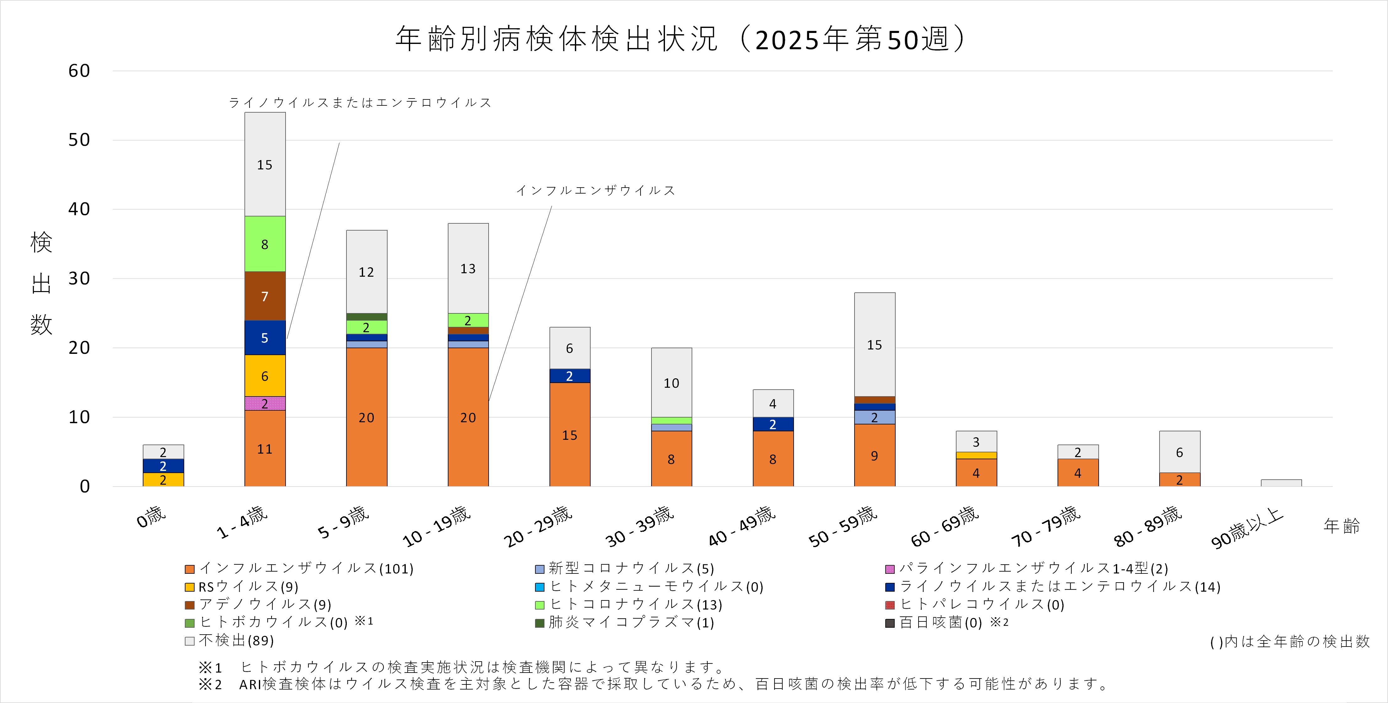 年齢層別にみると、1歳から80歳未満の幅広い年齢層でインフルエンザウイルスが検出され、5歳から20歳未満では採取された検体の半数以上からインフルエンザウイルスが検出されています。また、ヒトコロナウイルスも多くの年齢層で検出されており、1歳から5歳未満ではインフルエンザウイルスよりヒトコロナウイルスが多く検出されています。