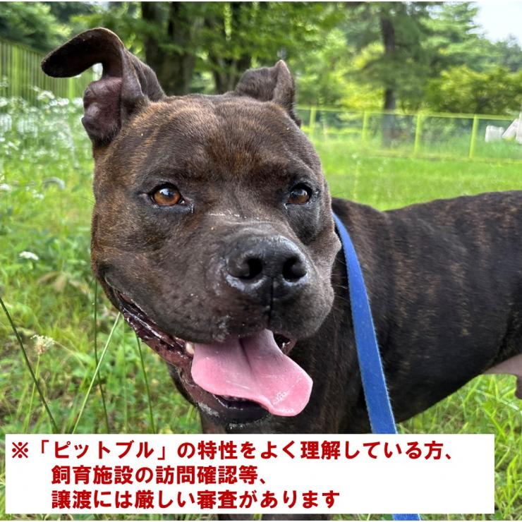 12月15日(月曜日)~12月19日(金曜日)まで 他の犬との相性にも注意が必要なので、この子だけの1頭飼いをお願いします。 現在トイレトレーニング中で、日々頑張っています! 体重:28kg ピットブルの特性上、譲渡には厳しい審査があります。