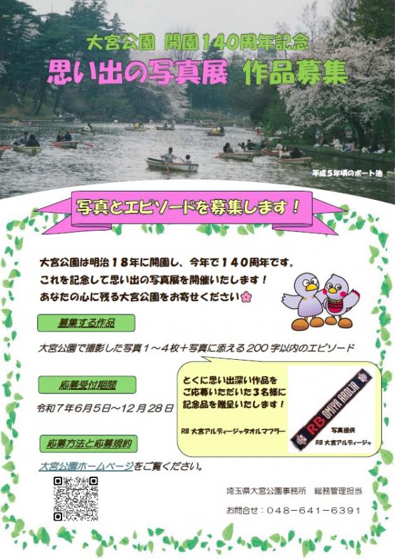 大宮公園は明治18年に開園し今年で140周年を迎えます。これを記念して、大宮公園の思い出をテーマにした写真展を開催します。あなたの心に残る大宮公園をお寄せください。